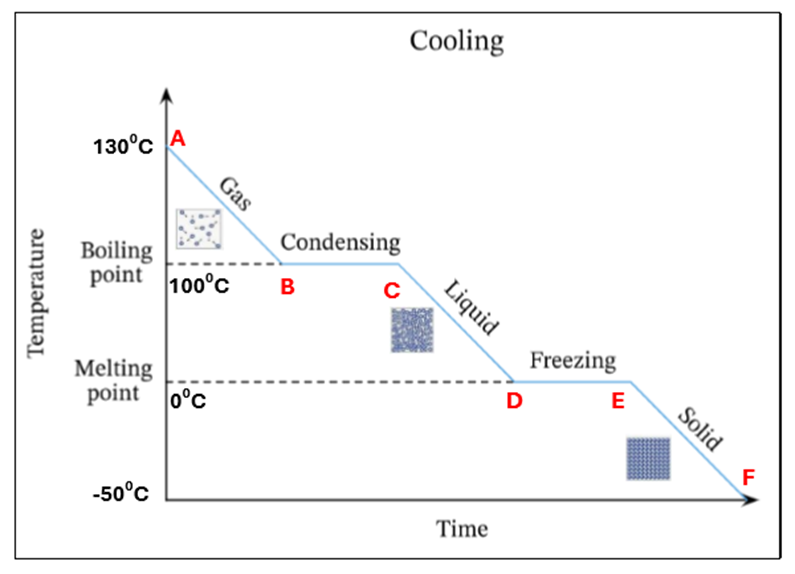 A-B | The temperature of the gas is decreasing (decrease in K.E) – still solid |