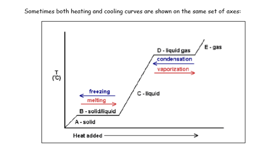 Diagonal Lines | Show a change in temperature (and K.E.). During these regions only a single state of matter exists, and the sample is getting hotter (colder in the case of cooling curves) |