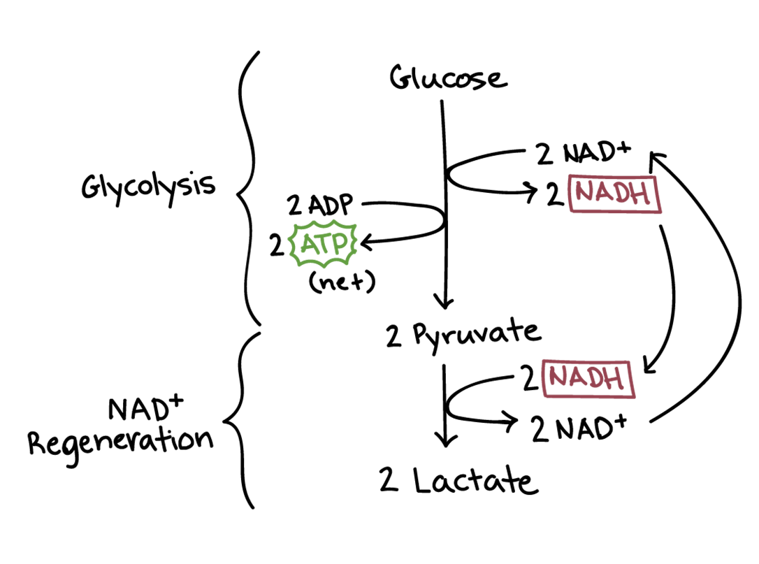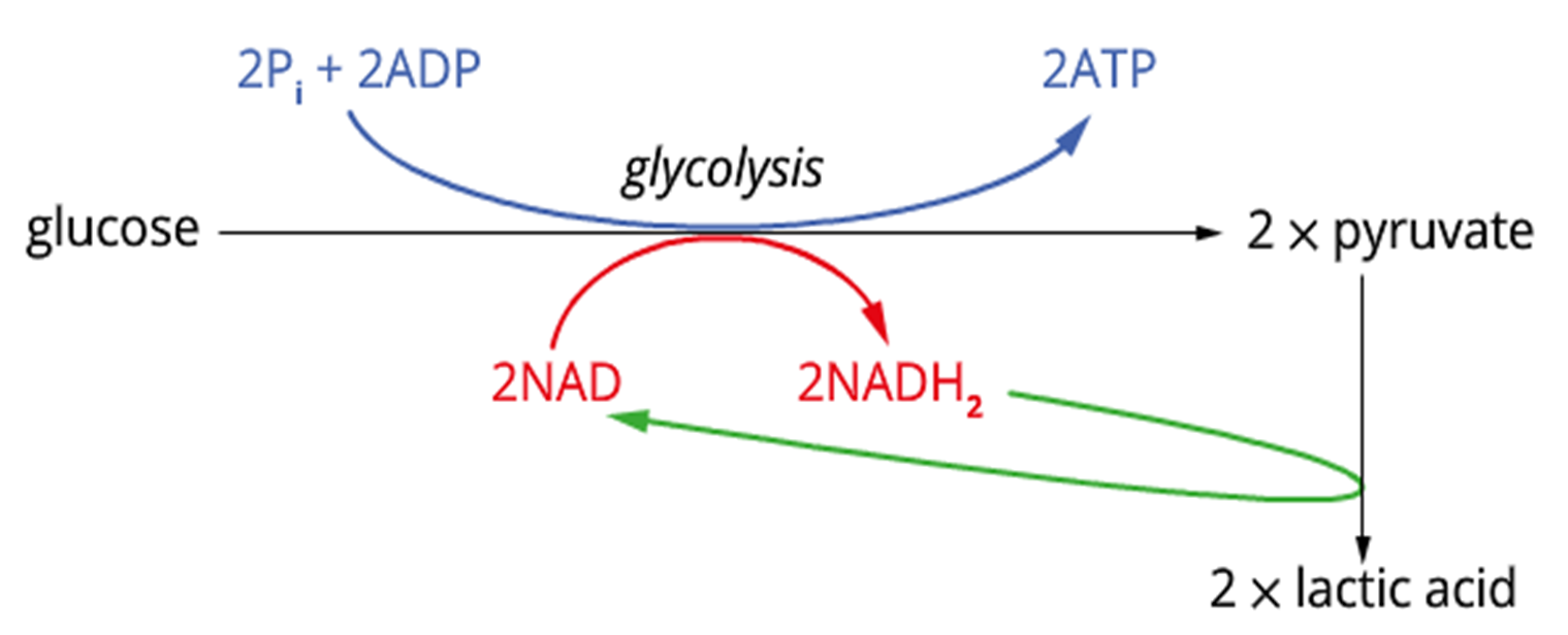 NAD+ can be used for further glycolysis, but lactic acid build-up is toxic