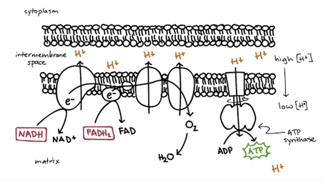 movement of protons (H+) and electrons across the inner mitochondrial membrane to generate ATP