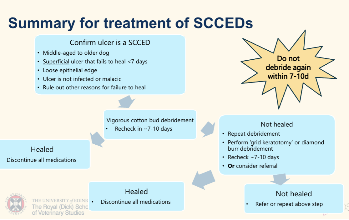 debribement of loose epithelium (mostly done in dogs, cats develop sequestrum easily esp with grid keratotomy
