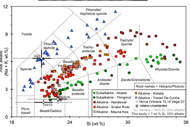 Venera 13 indicates high K2O content (4%) - alkali basalt composition