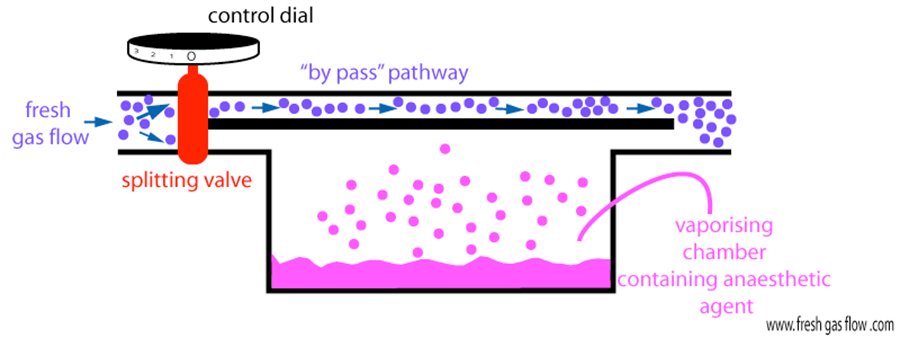 2. the stream that is diverted through the vaporising chamber passes through a wick system to become saturated with volatile anaesthetic vapour - the proportion of bypass to the vaporising chamber is controlled by the control dial - thereby determines the vaporiser output of volatile anaesthetic agent