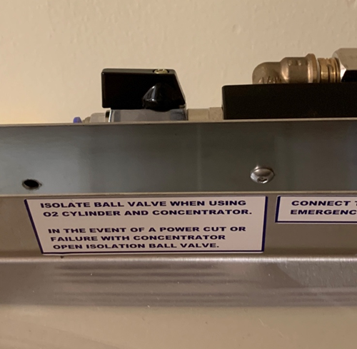 when only using oxygen from a cylinder (e.g. during a power cut). The concentrator must not be running when the ball valve is switched to ‘open’. The lever is horizontal, or in line with the pipe.