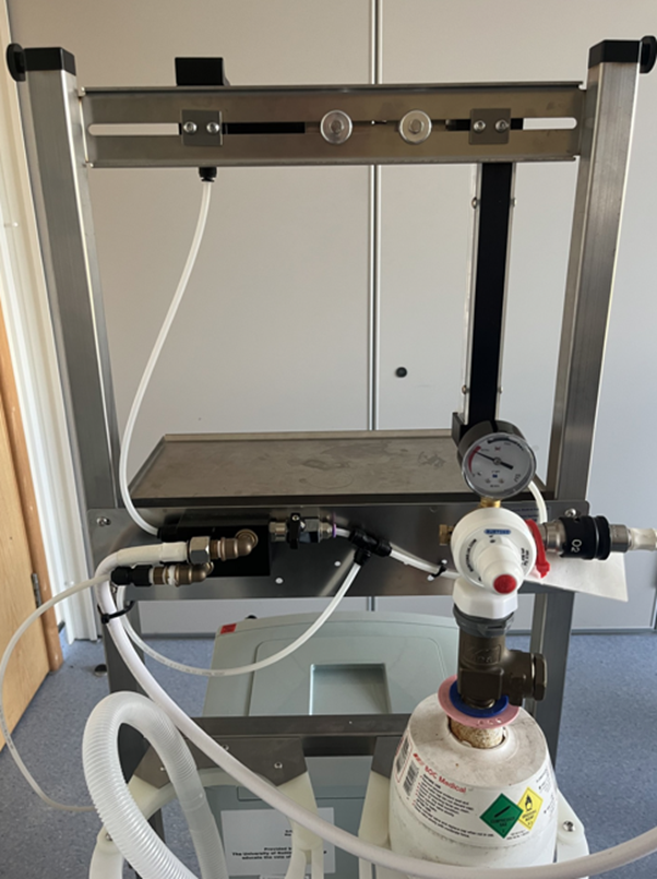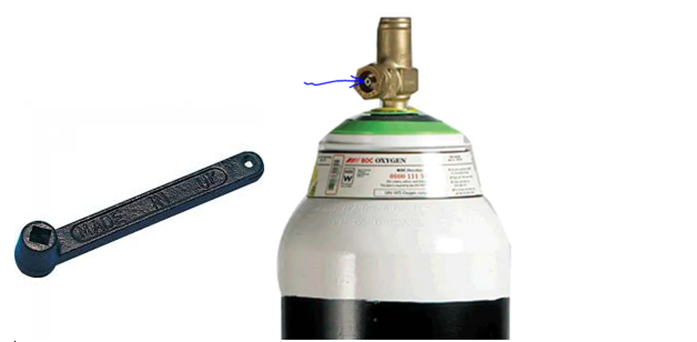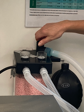 turn on oxygen clinder and ensure sufficient gas remains - use the cylinder key turn clockwise, see pressure gauge
