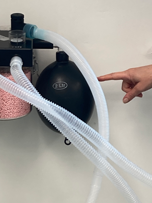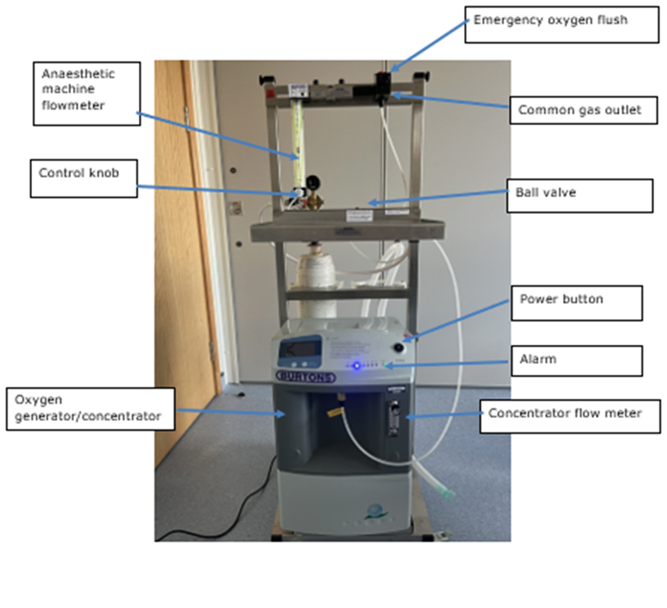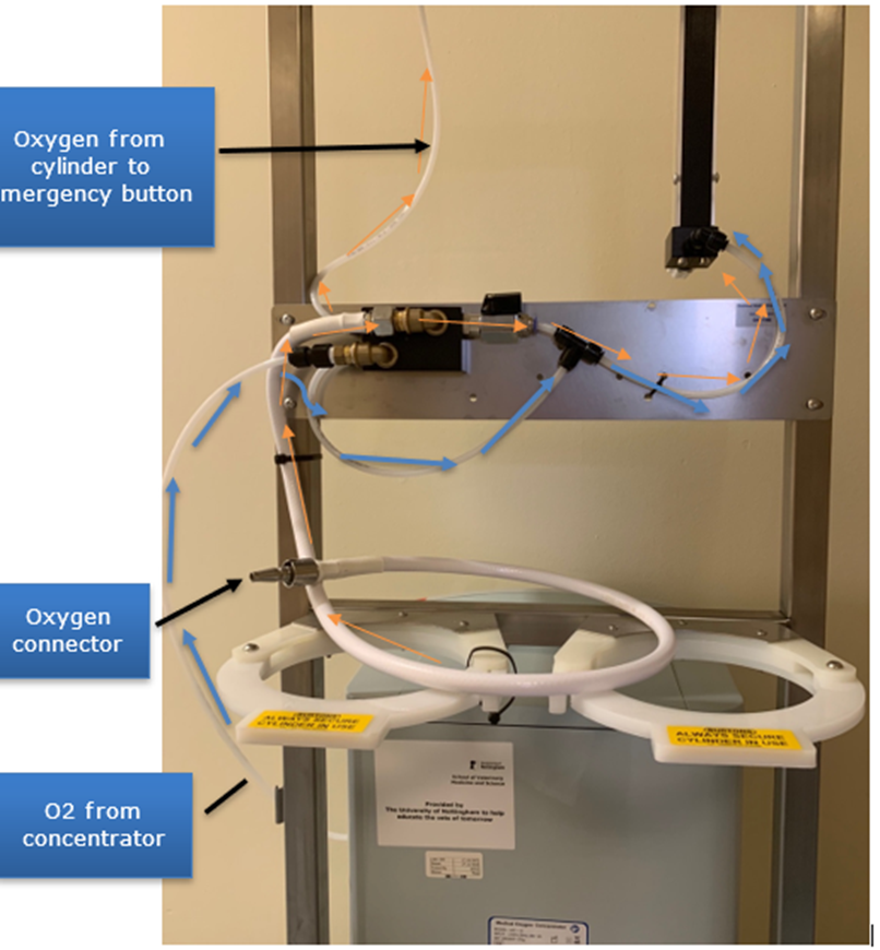 Oxygen travels from the concentrator to the anaesthetic machine flowmeter (blue arrows). At this point the ball valve is in isolation (closed) position i.e. perpendicular. Oxygen from the cylinder travels via the white tube to the emergency oxygen button (orange arrows)