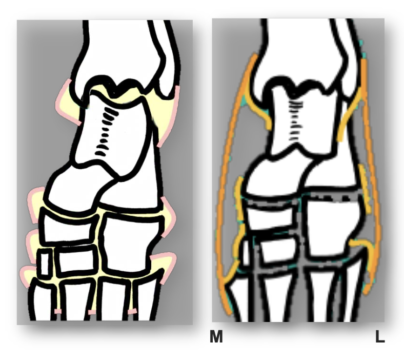 Fascia / retinaculum (Light yellow) → Joint capsule reinforcement within the retinaculum