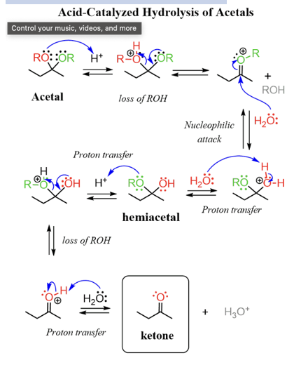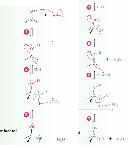 Provide products and mechanism for the acid-catalyzed formation of acetals (from aldehydes or ketones.)