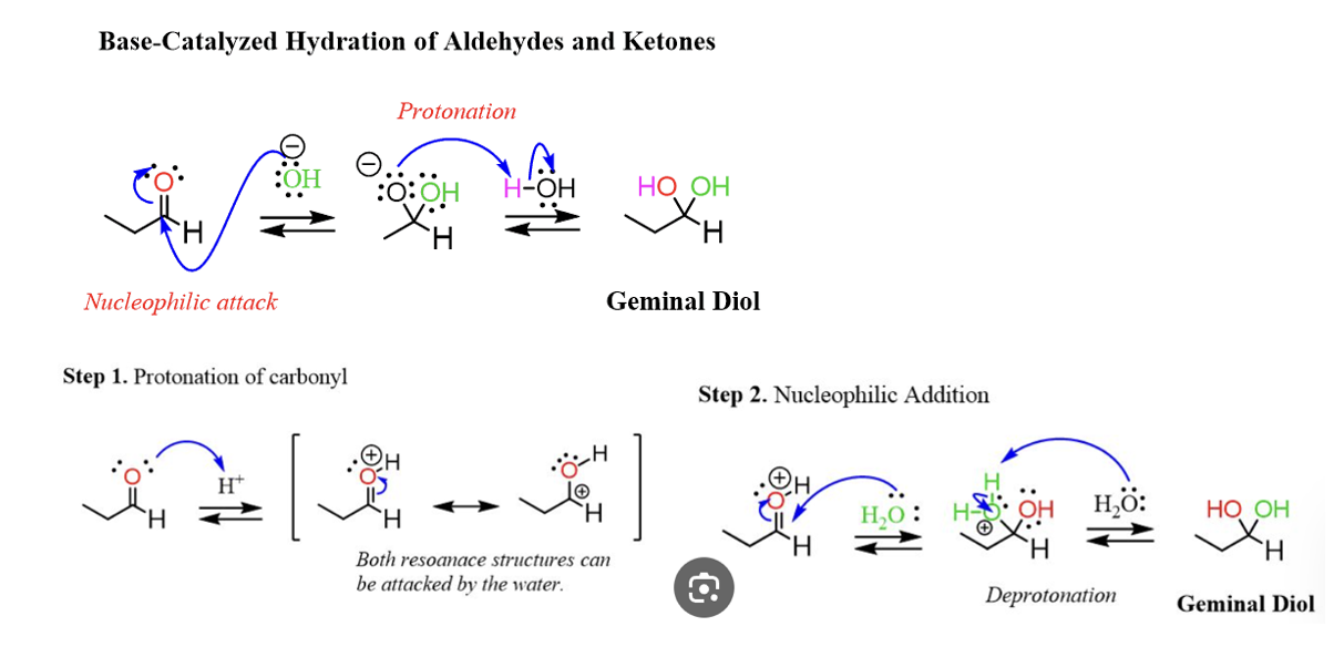 Provide products and mechanism for hydration of aldehydes and ketones under either acidic or basic conditions