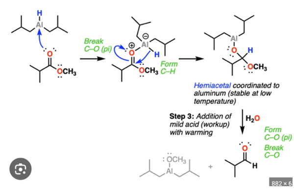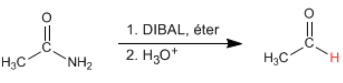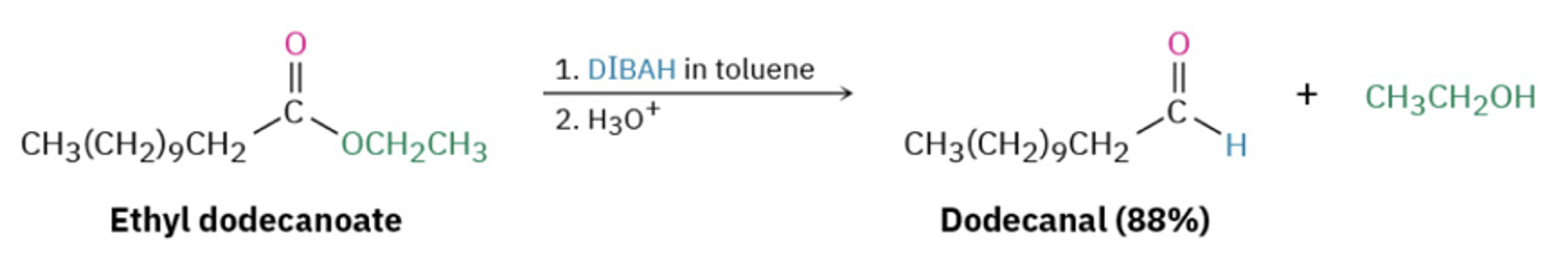 Provide the products of the reaction of 1 eq. DIBAL (= DIBAH), cold, with an ester AND to an amide