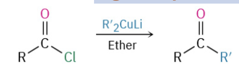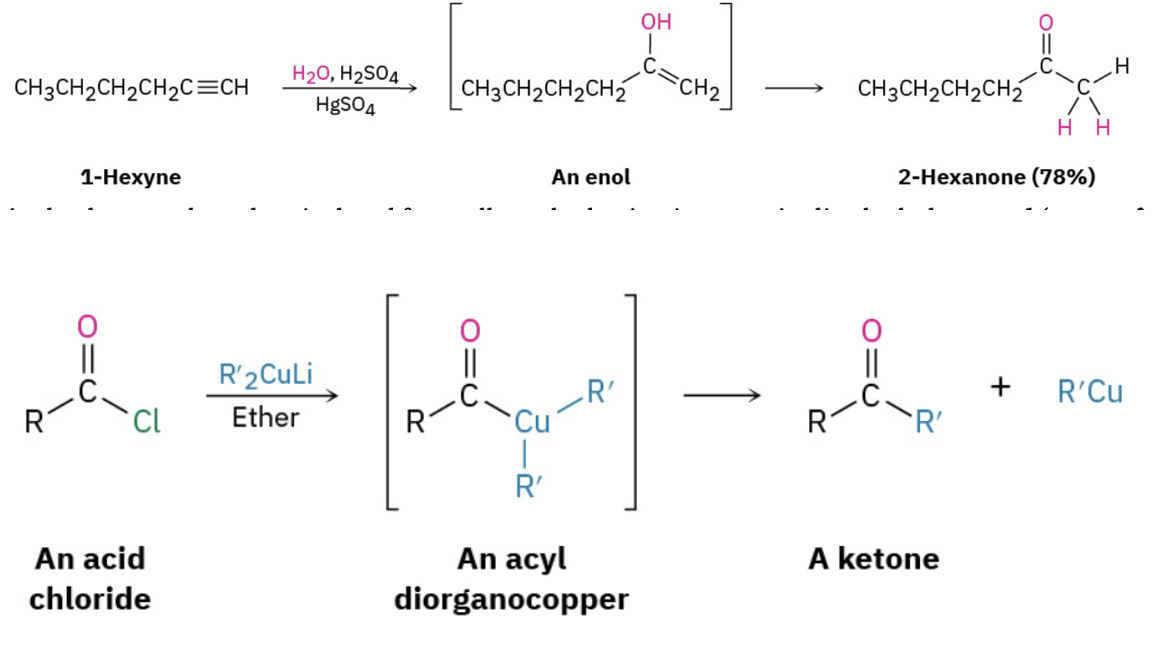 Synthesize ketones by oxidation of secondary alcohols, from the ozonation of alkenes, by addition of water to an alkyne , or from the reaction of an acid chloride and a cuprate