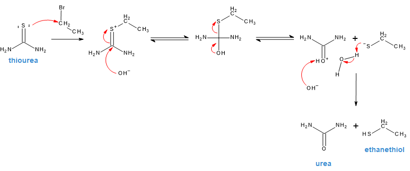 Provide missing reagents, products, and a mechanism for the synthesis of thiols by the alkylation and hydrolysis of thiourea.