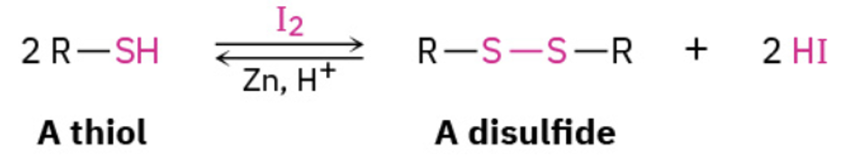 Provide products or missing reagents for the oxidation of thiols to disulfides using iodine and the reverse reduction using sodium borohydride or zinc/acid.