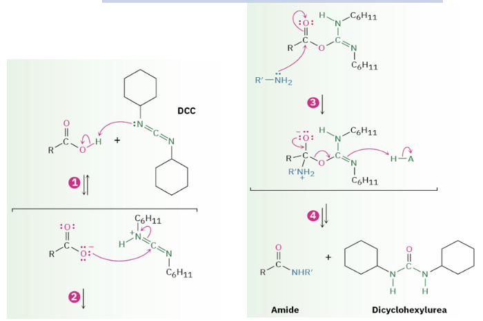 Provide products and a mechanism for the conversion of carboxylic acids + amines to amides using DCC.