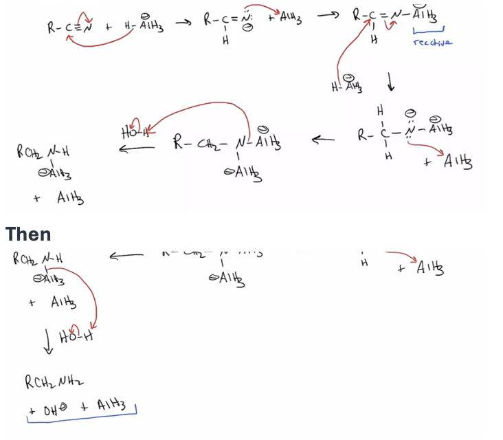 Provide products and a mechanism for the reduction of nitriles by the addition of LiAlH4.