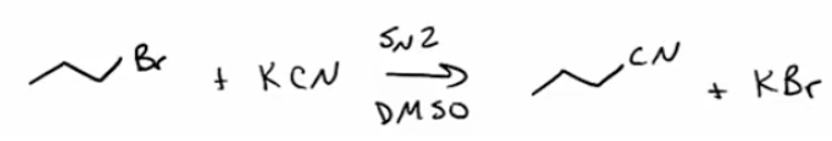 Provide a synthesis and mechanism (SN2) for nitriles from methyl or primary alkyl halides + KCN.
