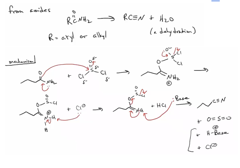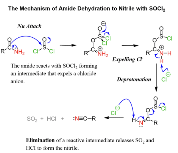 Provide products, missing reagents, or a mechanism for the dehydration of primary amides to nitriles upon addition of SOCl2.