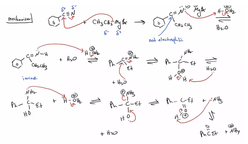 Provide products and a mechanism for the reaction of a nitrile with a Grignard followed by an aqueous acidic workup