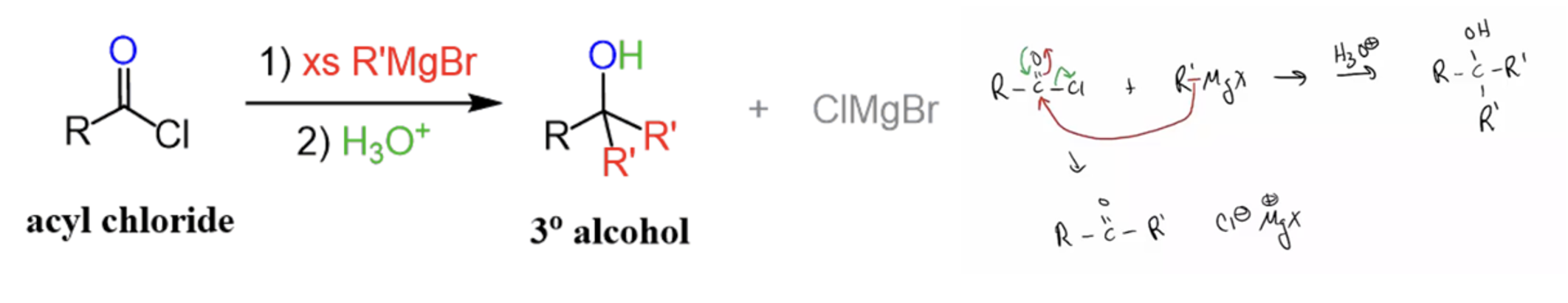 Provide products and a mechanism for the reaction of 2 equivalents of organolithium, organosodium, or Grignard reagents to an acid chloride
