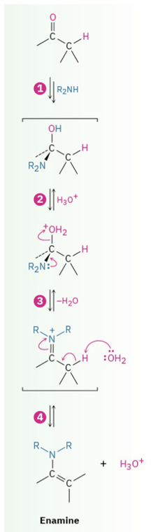 Provide a product and mechanism for the formation of enamines from aldehyde or ketone plus secondary amine.