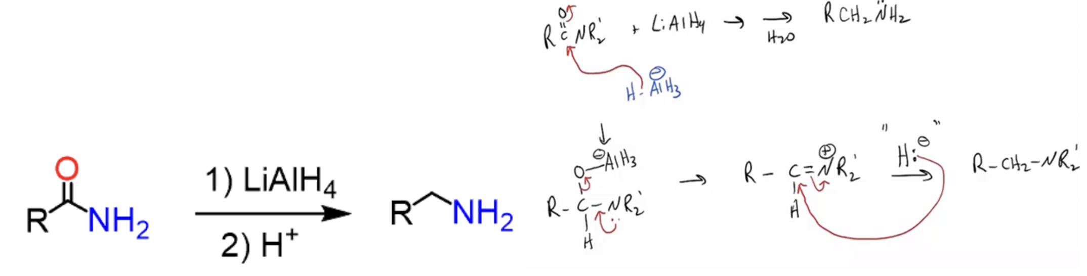Provide products and a mechanism for the reduction of amides by LiAlH4. (C=O becomes CH2.)