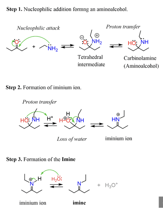 Provide products and mechanism for the formation of imines from aldehyde or ketone plus primary amine.