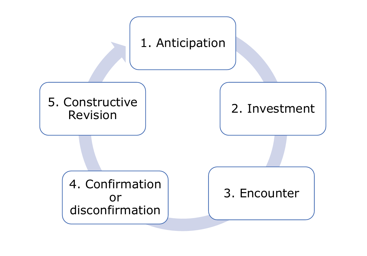 First, you anticipate what will happen by forming expectations based on your personal constructs. Then, you invest in those expectations by committing to them. After you encounter the actual event, your expectations are either confirmed or disconfirmed. Finally, through constructive revision, you adjust or revise your personal constructs based on what happened.