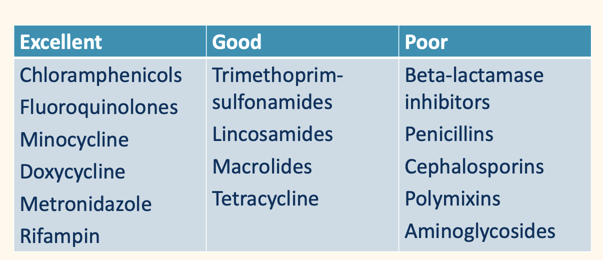 Aminoglycosides, chloramphenicols, 3rd and 4th generation cephalosporins, anti-Pseudomonas penicillins, rifampin