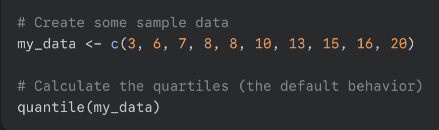 *if you do not specify the probs argument, R will calculate the quartiles by default; 0, 25, 75, 100