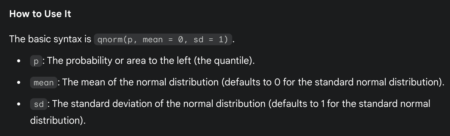 calculates the quantile function for the normal distribution; give qnoem a probability (value between 0 and 1) and it gives back the corresponding z-score (the value on the x-axis of a standard normal curve)