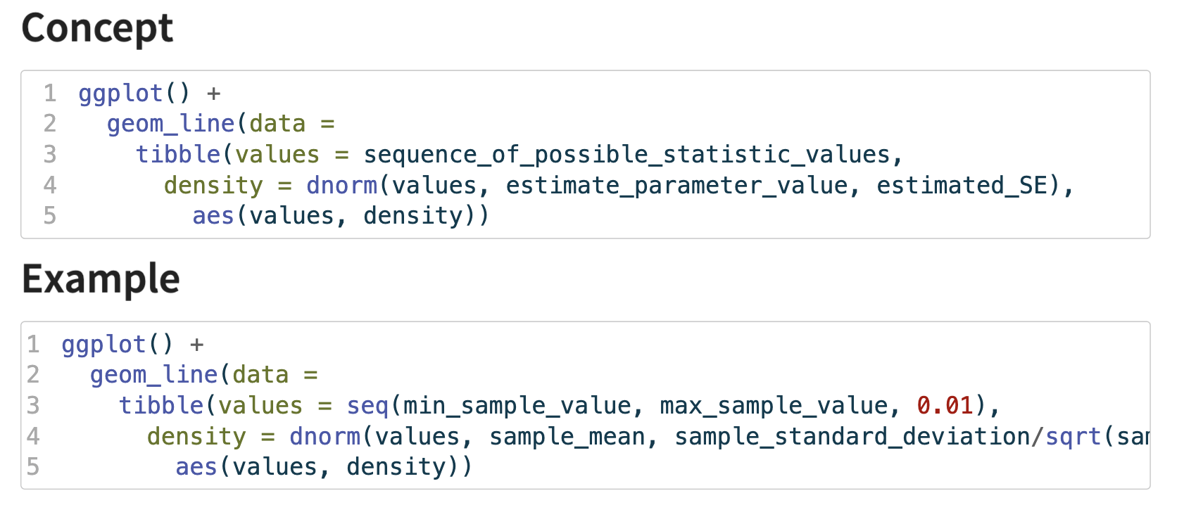 aes(values, density) : aesthetic mapping that tells geom_line() which columns to use for the plot: map the values column to the x-axis and the density column to the y-axis