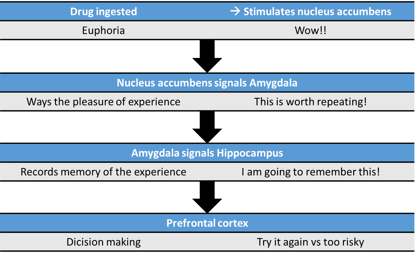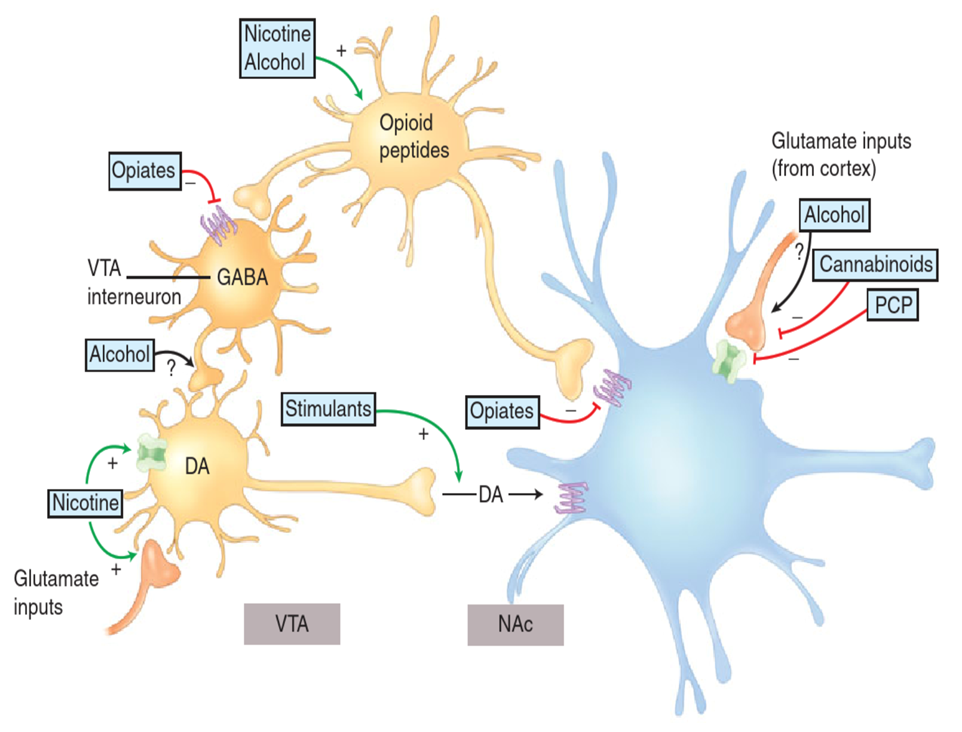 drug abuse activates VTA which releases dopamine onto the nucleus accumbens neurones giving the feeling of high and euphoria.