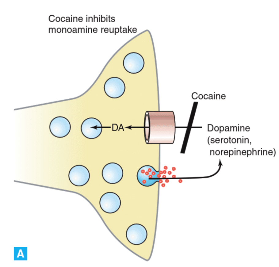 → Cocaine inhibits the activity of these transporters which means the neurotransmitters are being released but they are not taken back up so they accumulate in the synapse and you get much more dopamine present here