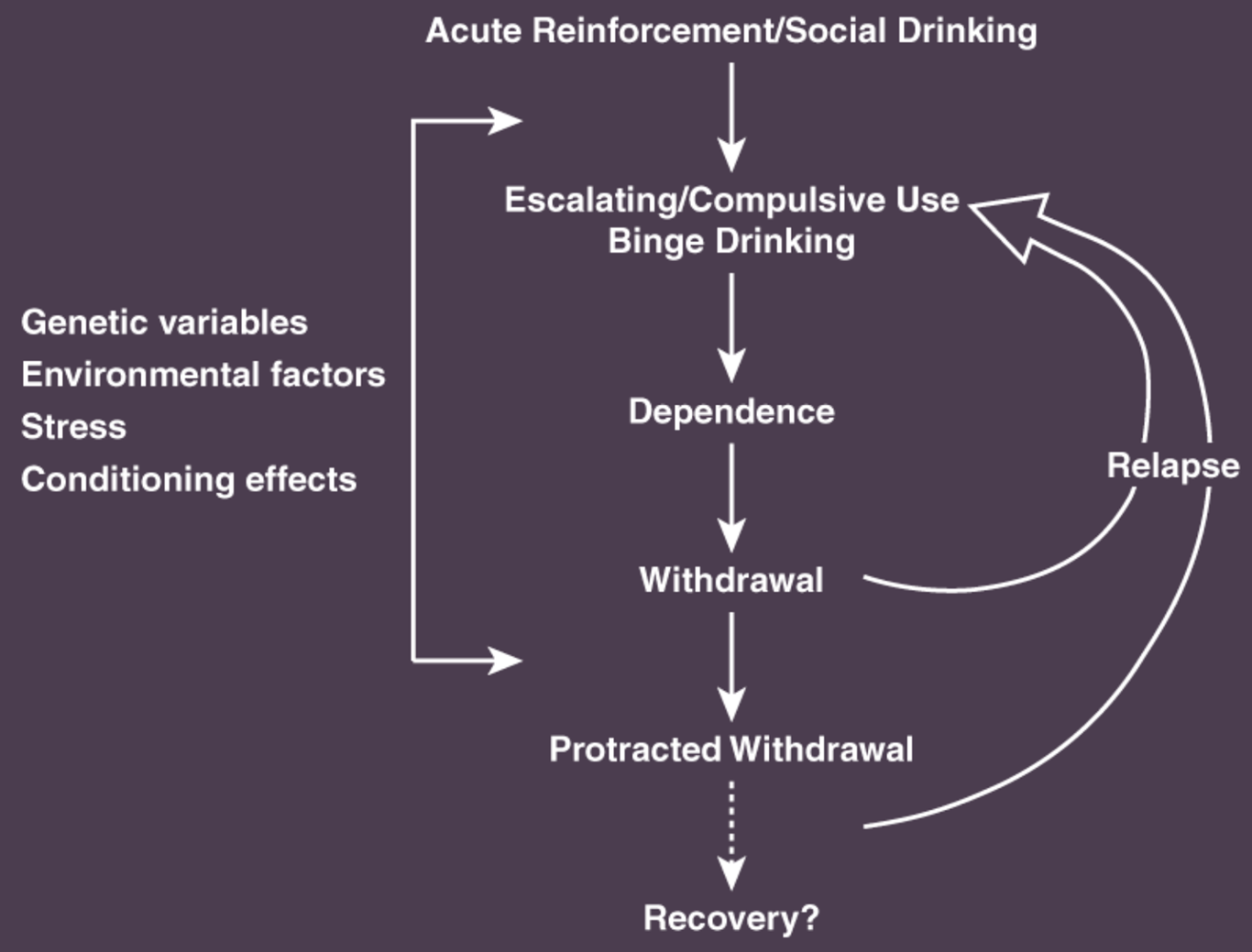 Acute enforcement in our brain - feels good when taking the drug. Brain remembers this pleasurable experience which leads to compulsive use of drug/alcohol. Withdrawal of drugs leads to withdrawal symptoms - makes them addicted.