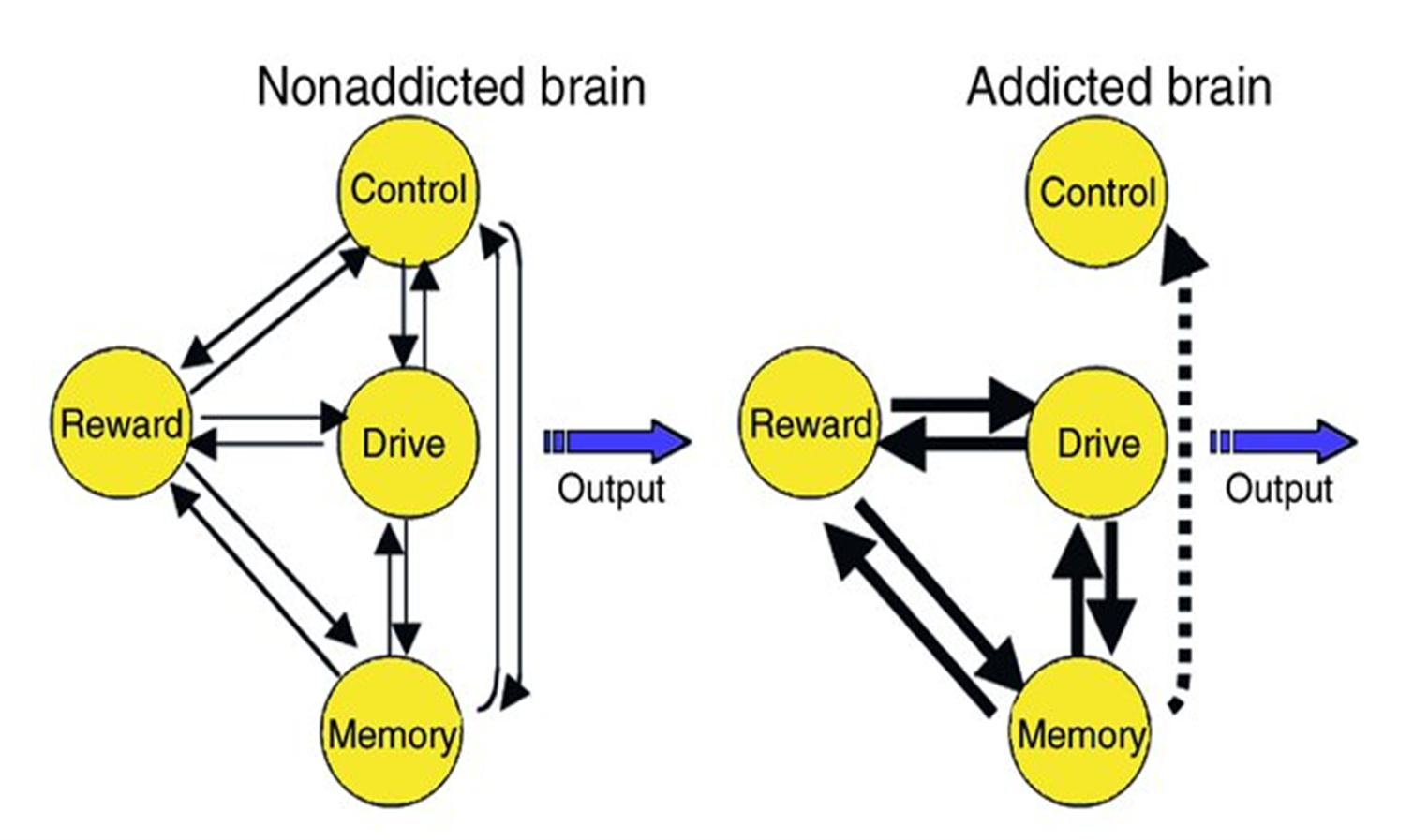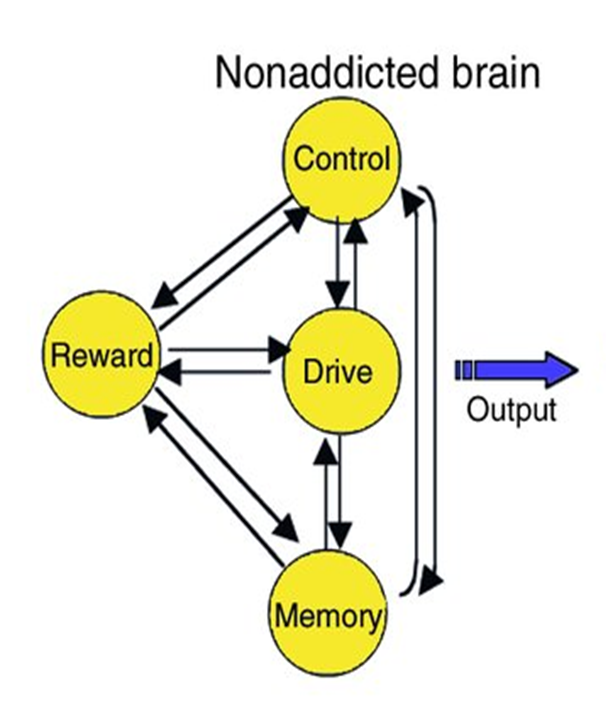 In addicted brain there is a stronger communication between the reward, drive and memory pathway which means the individual has to drive to feel the reward of the drug. The more they do this the more it strengthens the memory of having the motivation to find the drug and use it. → now the inhibitory pathway is much weaker