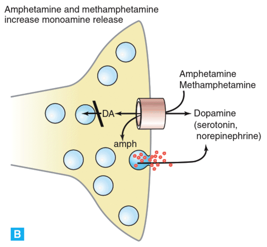Similar structure to monoaminergic molecules and as a result are taken up by transporters and packaged into vesicles instead of dopamine due to similar structure. As a result the neurone will start pumping them out leading to more dopamine being released.