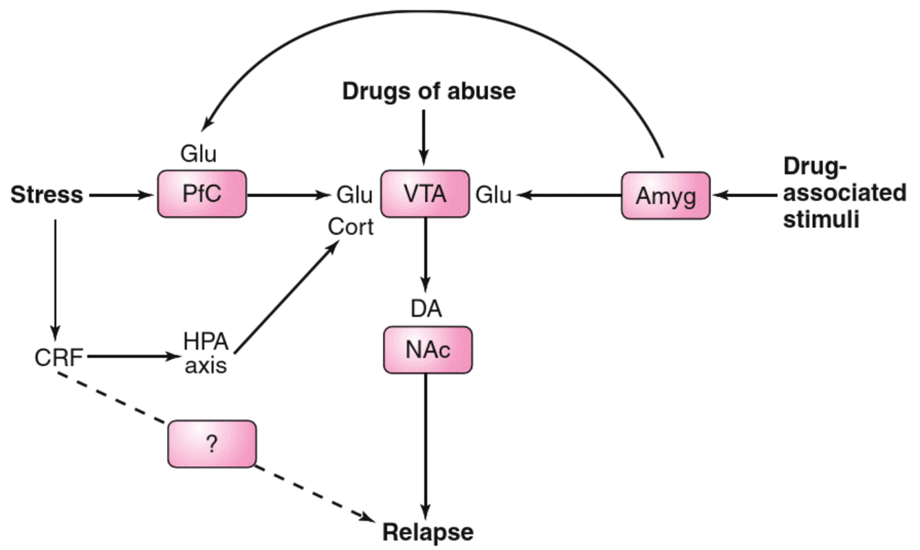 Primary pathways through which stress, drugs of abuse, and drug-associated stimuli are hypothesized to trigger relapse of drug-seeking behaviour
