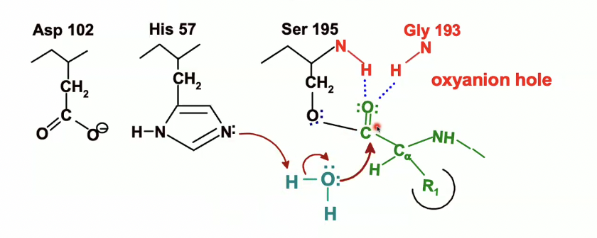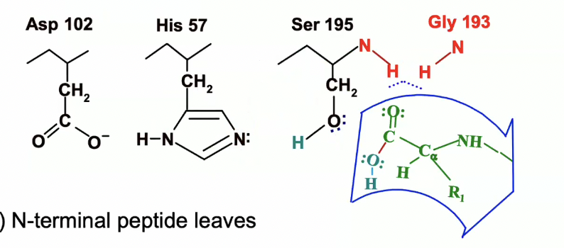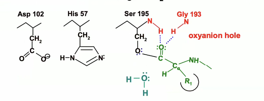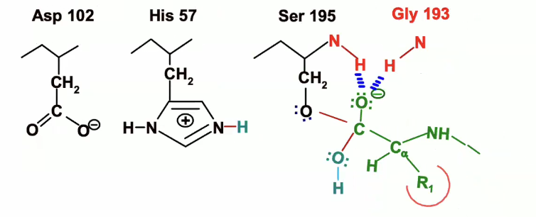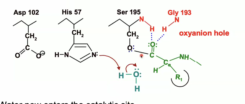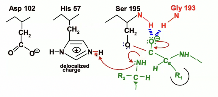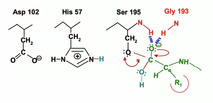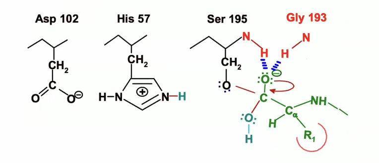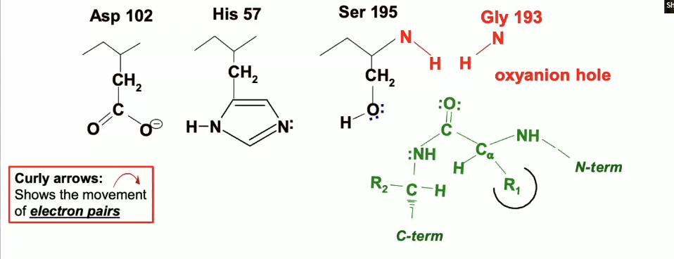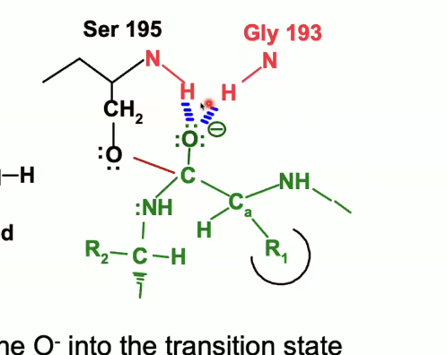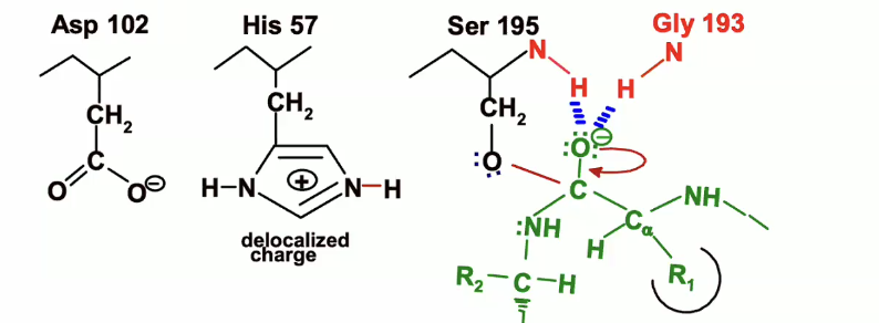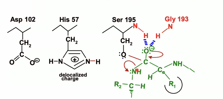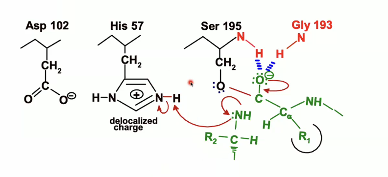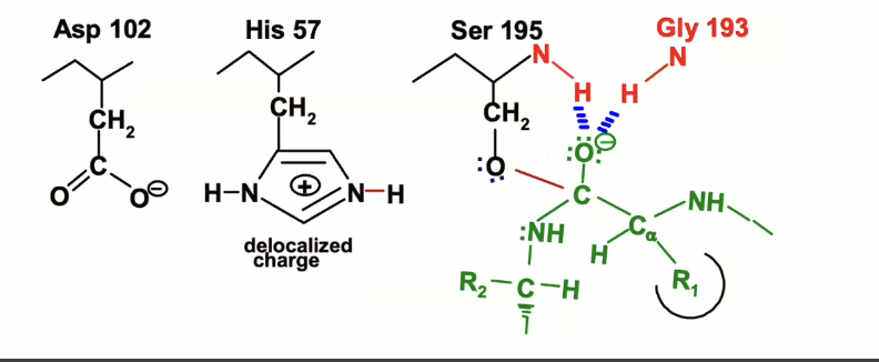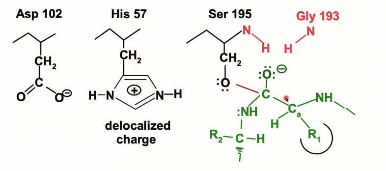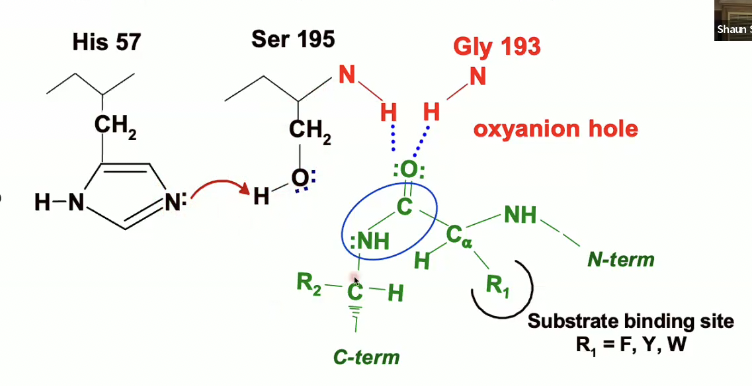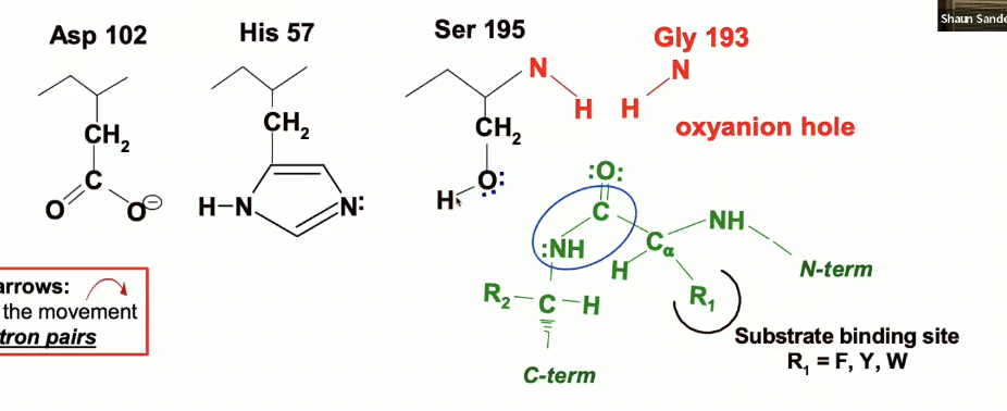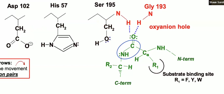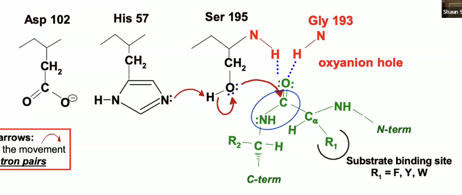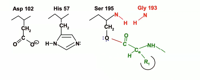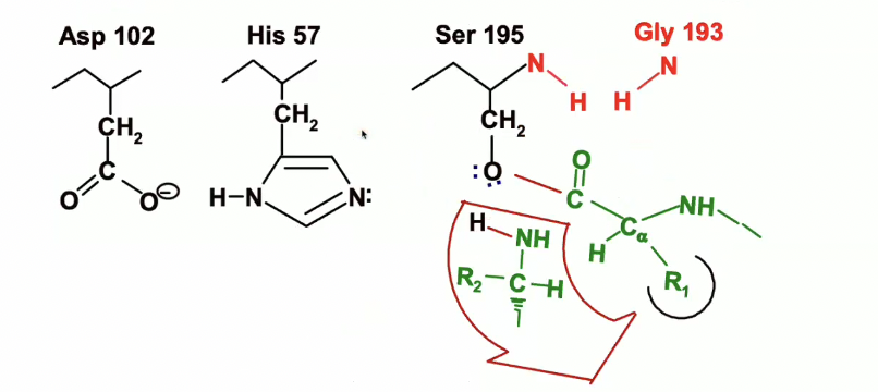 in green, we see a peptide/substrate approaching with a trp,tyr, or phe residue (R1) the peptide is specifically located in the binding pocket so that we can position the peptide bond rught near the Serine 195