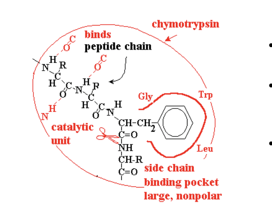 it binds weakly to peptide chain upstream of the target amino acids (phe, trp, tyr)
