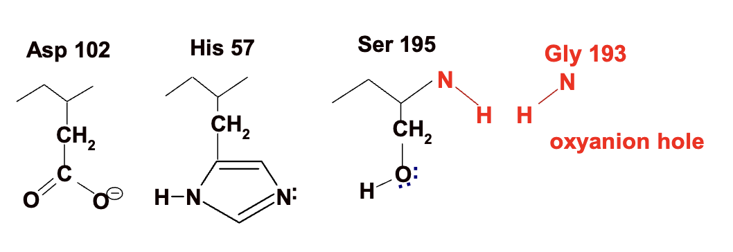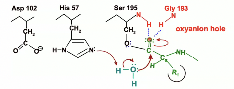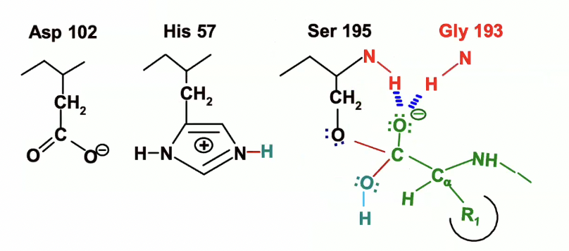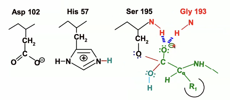 This is the start of the reaction where we see the chymotrypsin active site with the catalytic triad and the oxyanion hole.