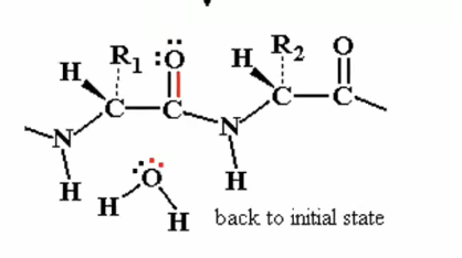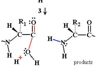 peptide bond is hydrolyzed and their is an exchange of protons to get NH2