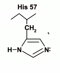 Replacing His with Lys reduces activity to 0.1% of normal, as His (pKa 6.5) acts as both a general base and acid at pH 7, while Lys (pKa 10.2) is a good base at neurtal pH but is a poor acid.