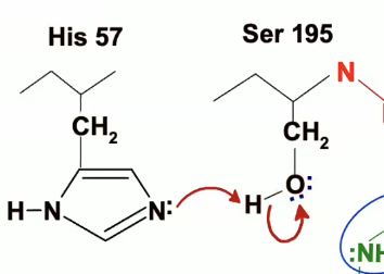 His 57 is going to act as a general base and will remove the proton from OH group on Ser 195 and will take that proton.