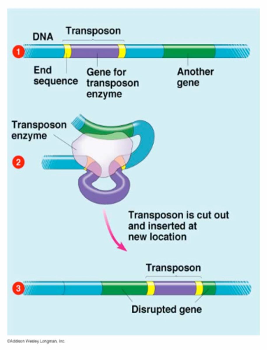 segment of DNA that can "jump" genome locations, can transfer genes to/from plasmid/chromosome