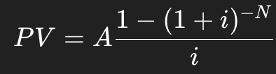 Present value of annuity paying A for N periods at rate i: