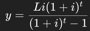 Loan repayment (annual payment y to amortise L in t years):
