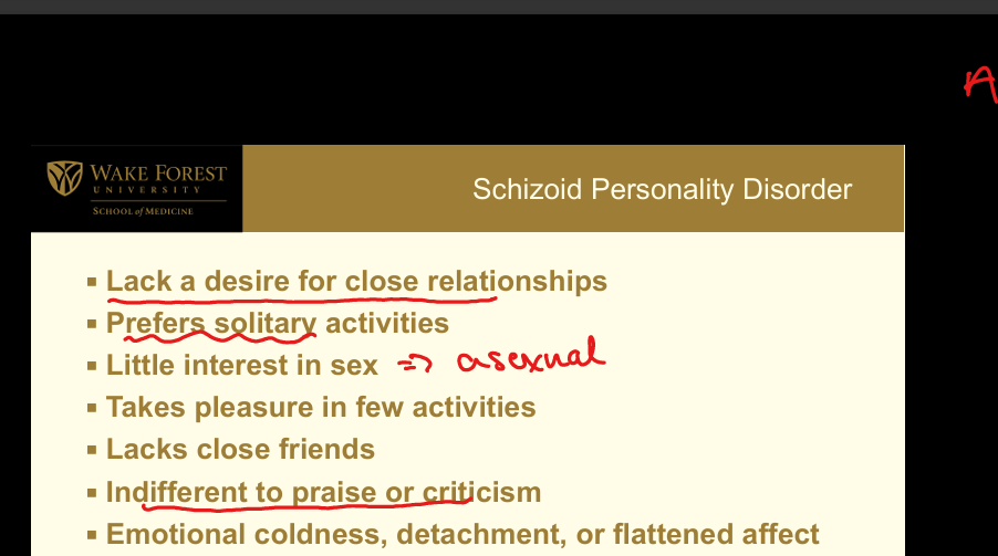 Cluster A (Odd or Eccentric): Detachment from social relationships; lacks desire for close relationships; prefers solitary activities; little interest in sex; takes pleasure in few activities; lacks close friends; indifferent to praise/criticism; emotional coldness and flattened affect. (Zoid as in alien who is solitary and lacks connections)