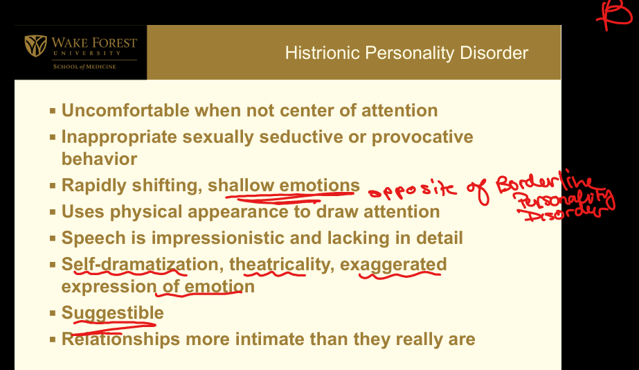 Cluster B (Dramatic, Emotional, or Erratic): Excessive emotionality and attention-seeking; uncomfortable when not center of attention; inappropriate sexual/provocative behavior; rapidly shifting shallow emotions; uses appearance for attention; impressionistic speech; theatrical/dramatic; suggestible; perceives relationships as more intimate than they are.