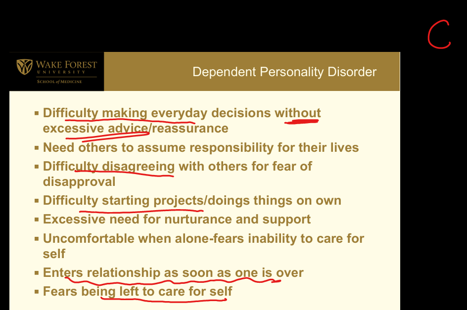 Cluster C (Anxious or fearful): Excessive need to be taken care of; difficulty making decisions without reassurance; needs others to assume responsibility; difficulty disagreeing due to fear of disapproval; difficulty initiating tasks; excessive need for nurturance/support; uncomfortable alone; urgently seeks new relationships when one ends; fears being left to care for self.