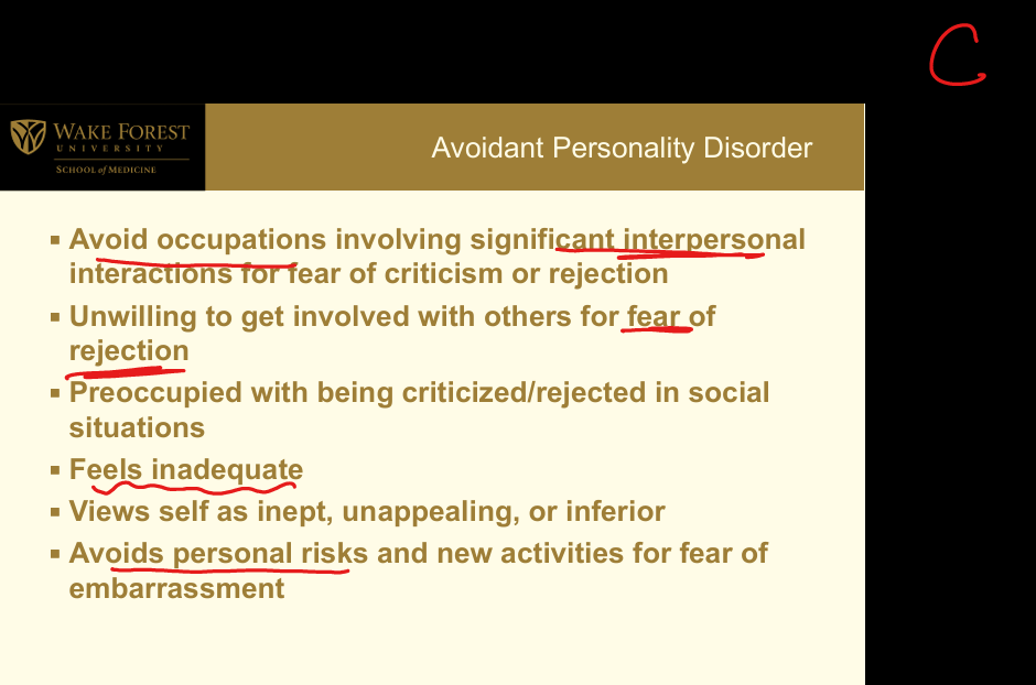 Cluster C (Anxious or fearful): Social inhibition and feelings of inadequacy; avoids interpersonal contact due to fear of criticism/rejection; unwilling to get involved unless certain of being liked; preoccupied with criticism; views self as inept/unappealing/inferior; avoids risks/new activities due to embarrassment.